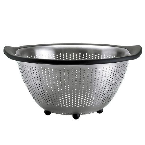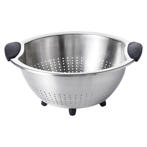 Shop OXO ® Stainless Steel 5 qt. Colander. All-over perforated stainless steel colander allows for quick and through straining and draining. Soft, non-slip handles provide a comfortable grip, while the five-footed base provides sturdy, stable support in the sink or on the countertop. ... Retrieve Content